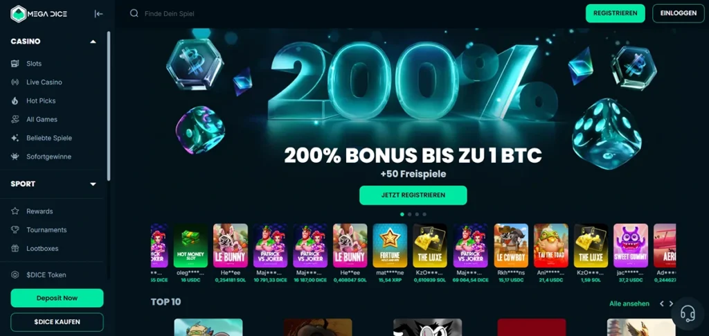 Platz 2: Mega Dice – Casino ohne Paysafecard Konto nutzen