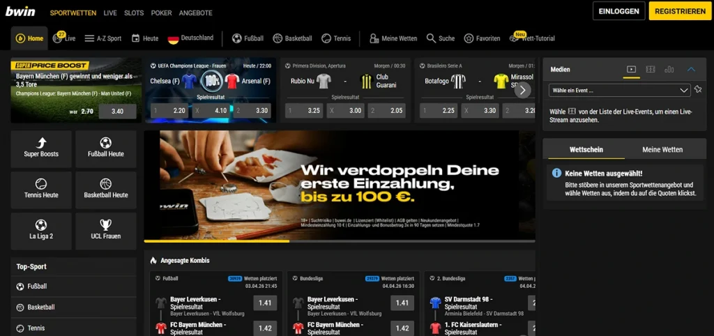 Bwin gehört zu den Pionieren auf dem deutschen Sportwettenmarkt und genießt aufgrund seiner langjährigen Erfahrung und der offiziellen GGL-Lizenz ein enormes Vertrauen bei den Spielern. Besonders hervorzuheben ist die benutzerfreundliche Plattform, die sowohl Einsteigern als auch Profis eine intuitive Navigation ermöglicht. Wer nach einem verlässlichen Anbieter sucht, der Sportwetten mit Paysafecard anbietet, kommt an Bwin kaum vorbei, da die Integration dieser Zahlungsmethode hier besonders nutzerfreundlich gestaltet wurde.